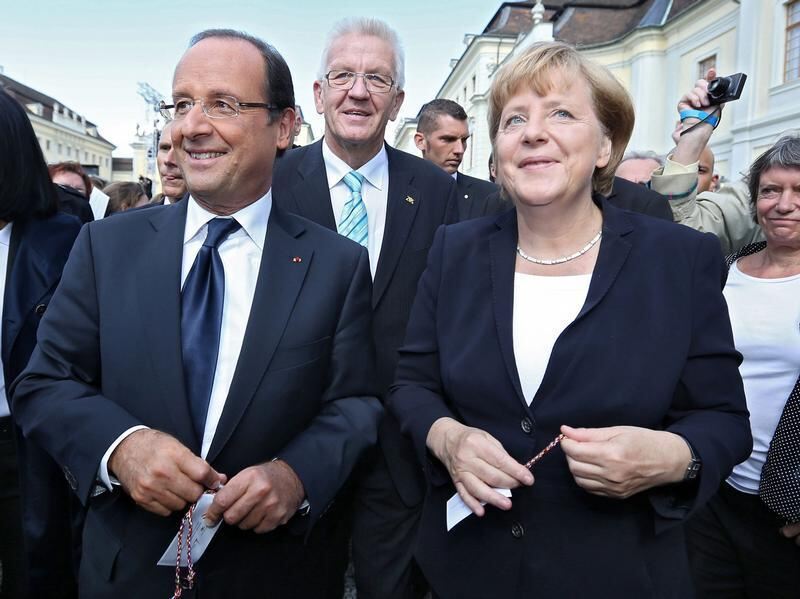 Bundeskanzlerin Angela Merkel und der französische Staatspräsident Francois Hollande im baden-württembergischen Ludwigsburg. Foto: Thomas Niedermüller