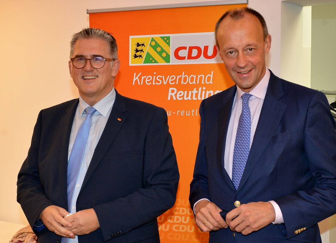 Der Reutlinger CDU-Bundestagsabgeordnete Michael Donth (links) freut sich, dass er Friedrich Merz nach zwanzig Jahren wieder in die Achalmstadt locken konnte. FOTO: NIETHAMMER
