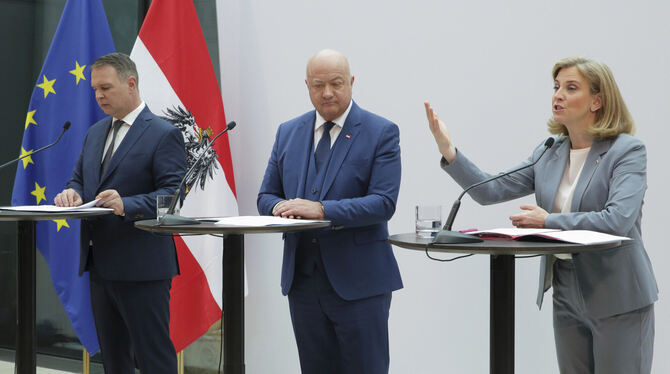 Die Parteivorsitzenden Christian Stocker von der Volkspartei (M, ÖVP), Andreas Babler von den Sozialdemokraten (l, SPÖ) und Beate Meinl-Reisinger von den NEOS, stellen ihr Regierungsprogramm vor.