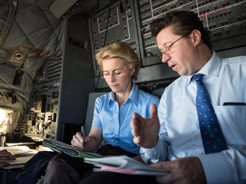 Bundesverteidigungsministerin Ursula von der Leyen (mit Ministeriums-Abteilungsleiter Geza Andreas von Geyr) sucht eine Lösung für die Pannenserie bei der Bundeswehr. Foto: Maja Hitij