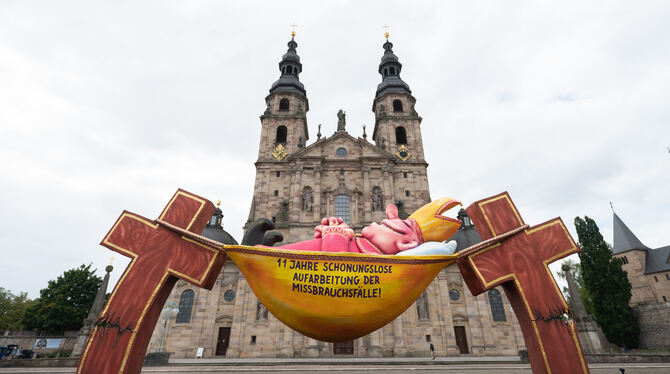 Mit der Plastik »Der Hängemattenbischof« protestieren Betroffeneninitiativen vor dem Fuldaer Dom gegen sexuellen Missbrauch in der Kirche.