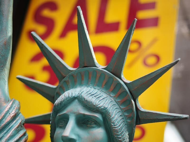 Ein Modell der Freiheitsstatue vor einem Geschäft mit einem Plakat »Sale« in Manhattan. (Symbolbild)