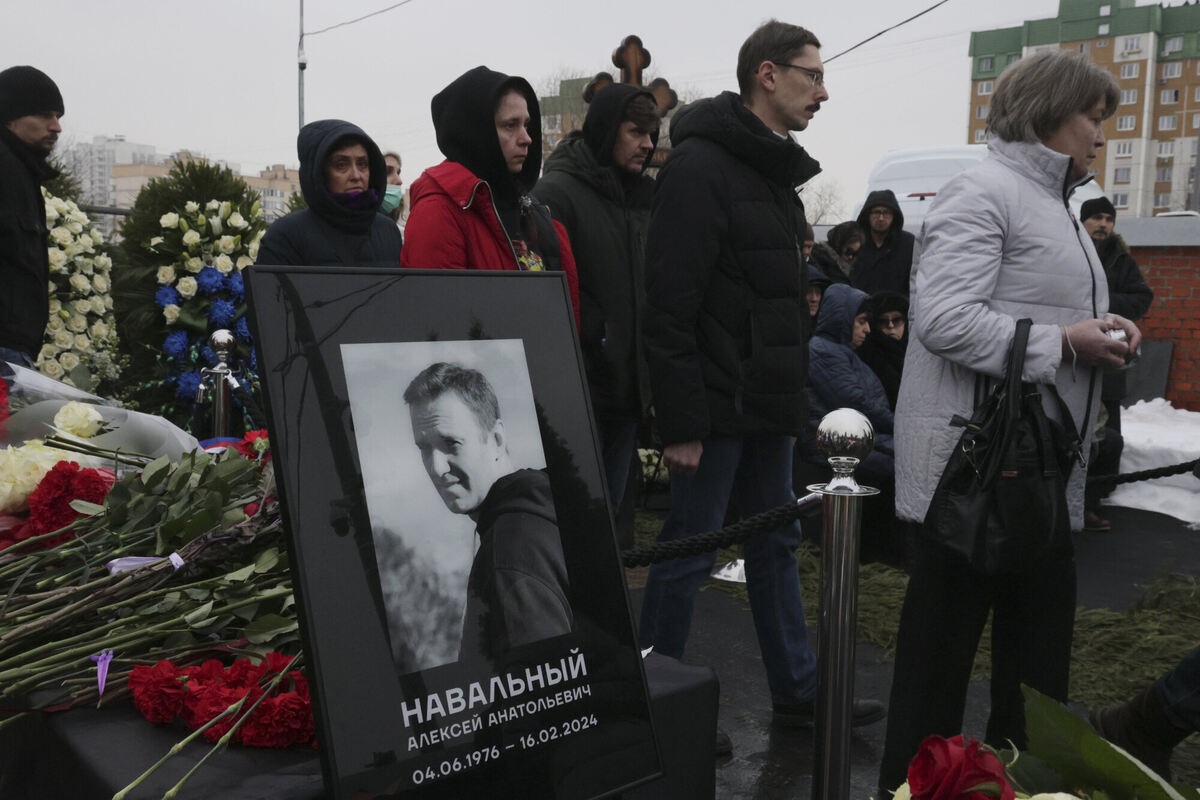 Menschen gehen während der Beerdigungszeremonie auf dem Friedhof Borisowskoje an einem Porträt des russischen Oppositionellen Alexej Nawalny vorbei.
