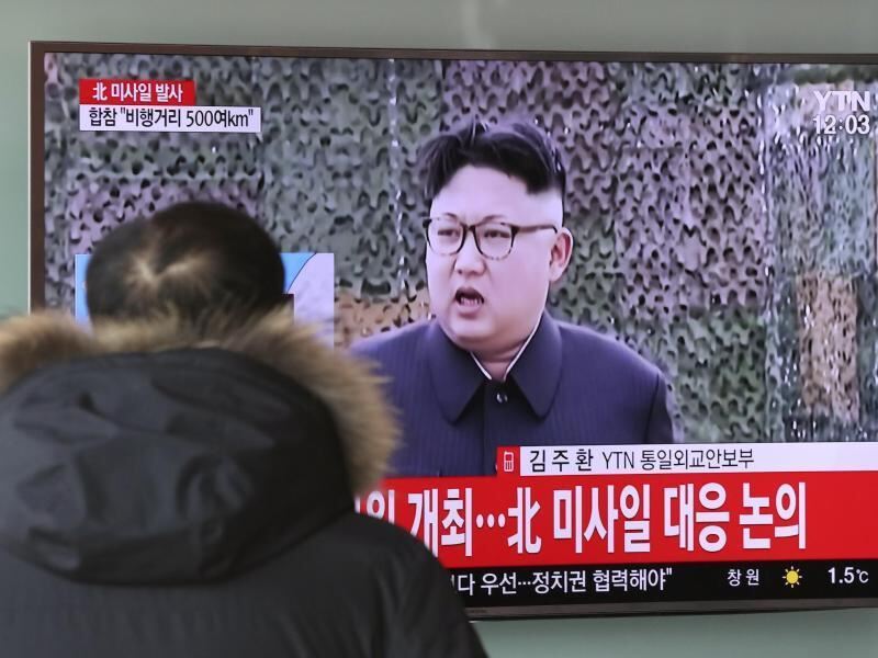 An einem Bahnhof in Seoul ist auf einem Fernseher der nordkoreanische Machthaber Kim Jong Un zu sehen. Das Schriftband auf dem TV lautet: »Der Norden hat eine Rakete abgefeuert«. Foto: Lee Jin-Man