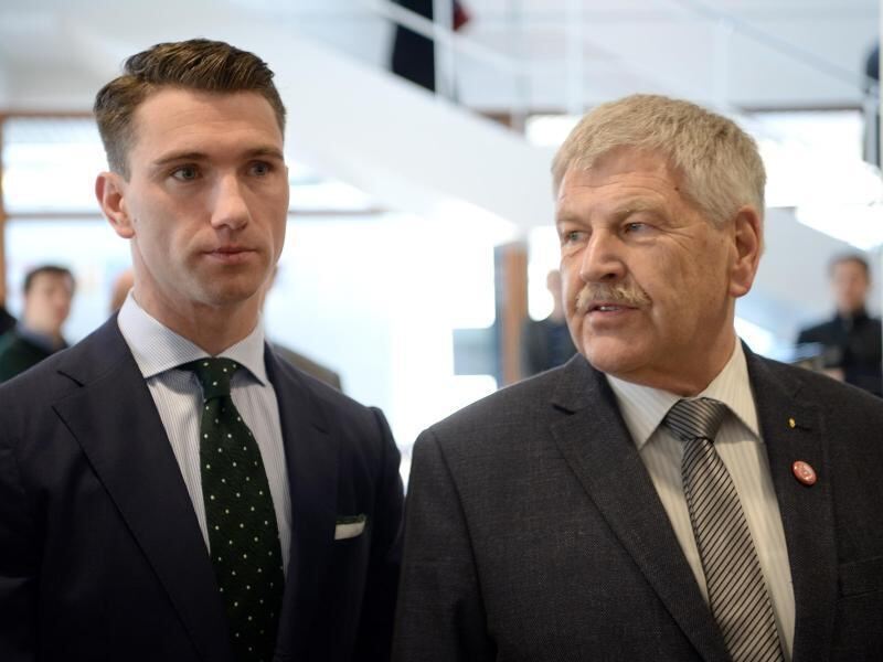 Der NPD-Parteivorsitzende Frank Franz (l) und der NPD-Europaabgeordnete Udo Voigt im Bundesverfassungsgericht. Foto: Marijan Murat