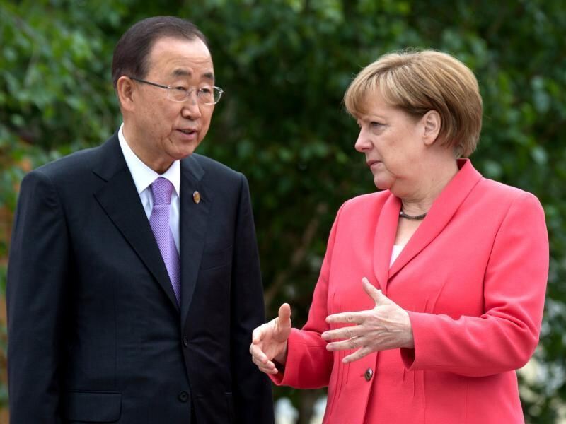 Bundeskanzlerin Angela Merkel und UN-Generalsekretär Ban Ki Moon im bayerischen Elmau. Foto: Peter Kneffel/Archiv