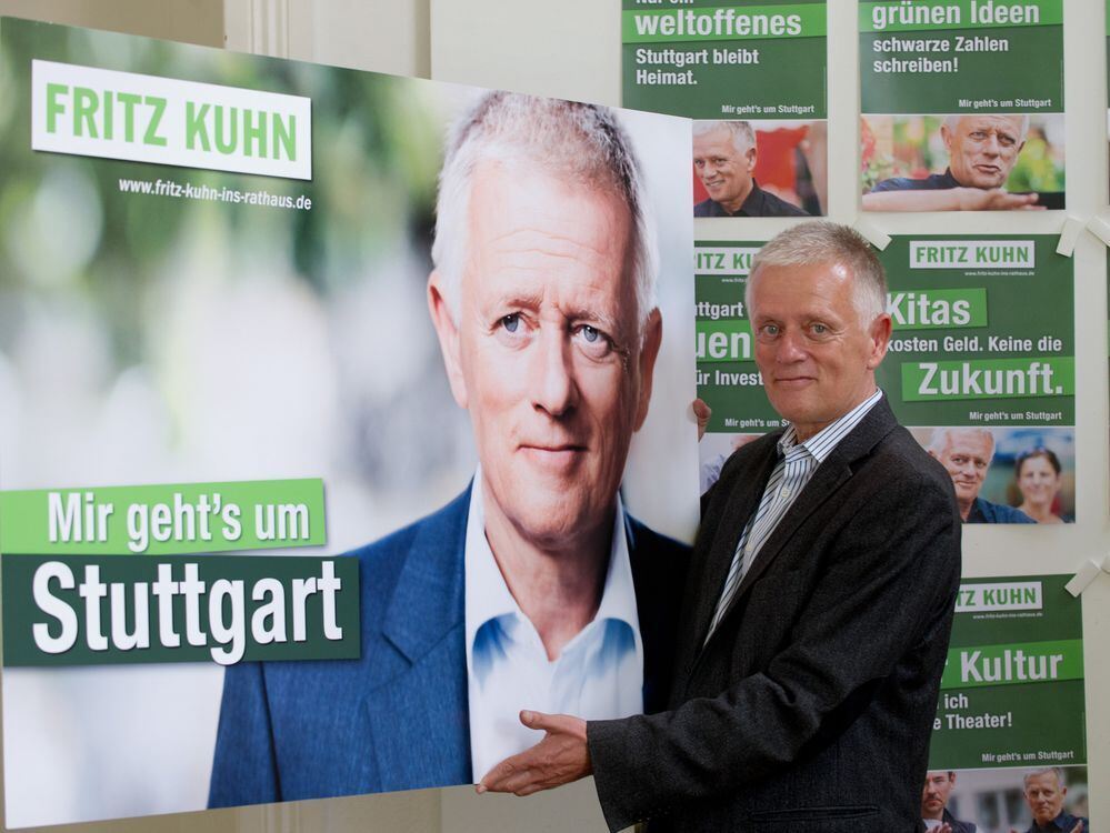 Der Stuttgarter Oberbürgermeister-Kandidat Fritz Kuhn (Bündnis 90/Die Grünen) präsentiert in Stuttgart Wahlkampfplakate.