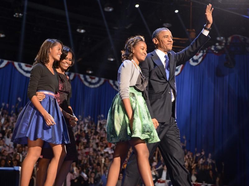 Ehefrau Michelle und die zwei Kinder Sasha and Malia Ann freuen sich über die Wiederwahl von Papa Barack Obama. Foto: Shawn Thew
