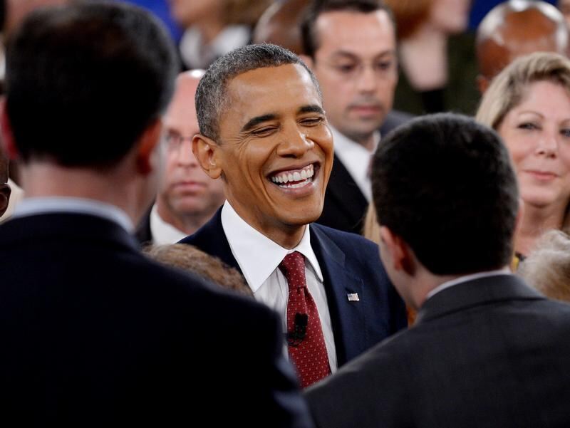 Sichtlich erleichtert plaudert US-Präsident Barack Obama nach dem Rededuell mit Zuschauern. Foto: Justin Lane