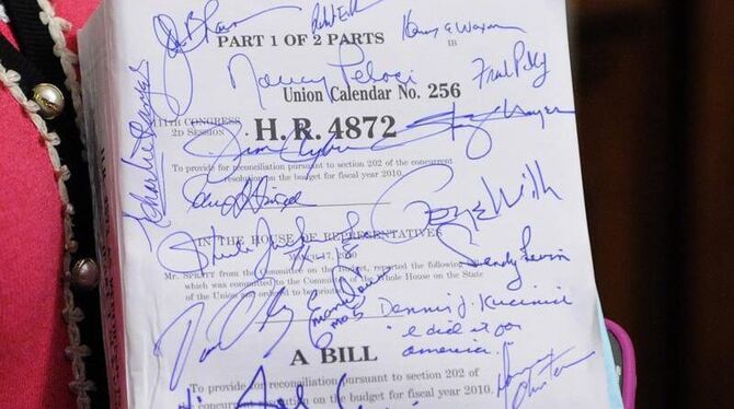 Washington (dpa) - Nach der Zustimmung des Abgeordnetenhauses zur Gesundheitsreform geht die Gesetzesprozedur noch eine Weile weiter. Hintergrund ist die Regel, dass beide Kongresskammern - Senat und Abgeordnetenhaus - stets identische Vorlagen verabschieden müssen, bevor sie dann der Präsident als Gesetz in Kraft setzen kann.