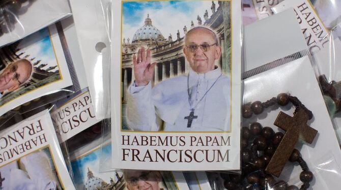 Bildchen und Rosenkränze mit dem neuen Papst Franziskus sind in Rom bereits zu haben.