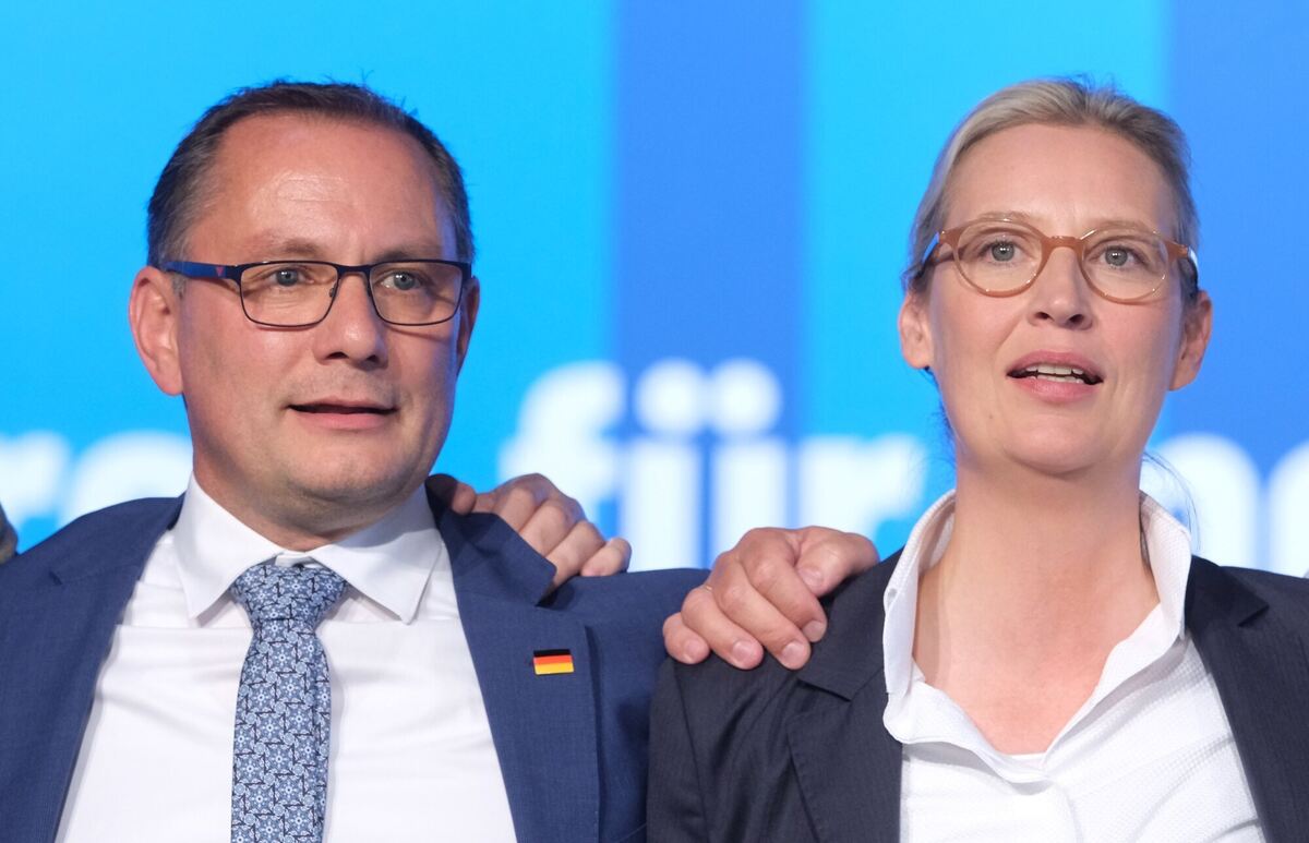 Tino Chrupalla, AfD-Bundesvorsitzender und Vorsitzender der AfD-Bundestagsfraktion und Alice Weidel, AfD-Bundesvorsitzende und Fraktionsvorsitzende der AfD-Bundestragsfraktion singen die Nationalhymne. Vom Umgang der etablierten Parteien miteinander profitiert vor allem die als rechtsextremistischer Verdachtsfall eingestufte AfD.