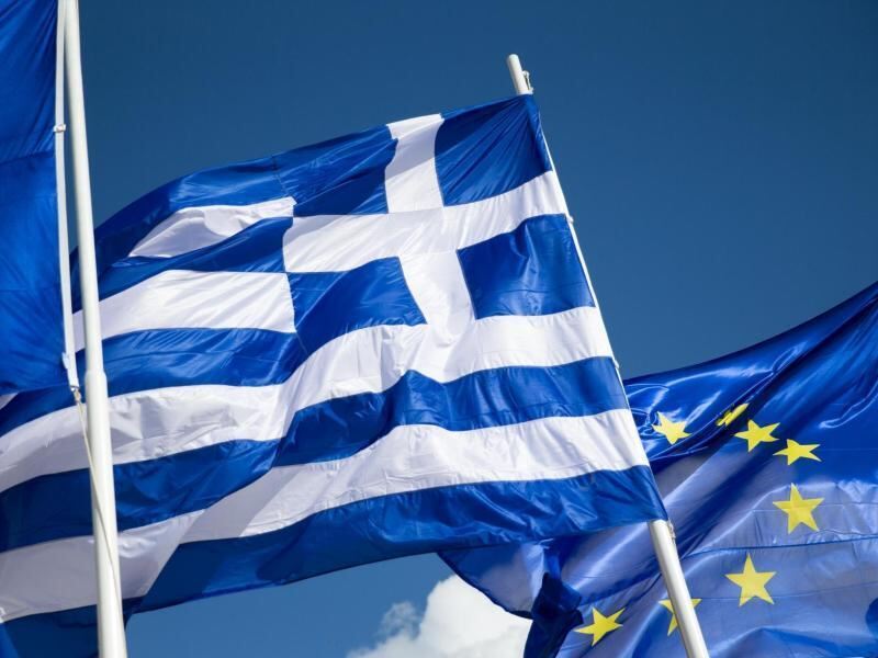 Die griechische Flagge weht zwischen zwei Europafahnen in Athen. Foto: Michael Kappeler/Illustration