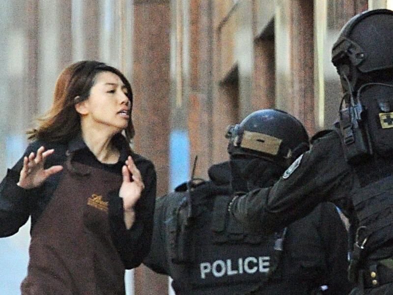Eine entkommene Geisel flüchtet in Richtung der Polizei-Spezialeinheit. Foto: Joel Carrett