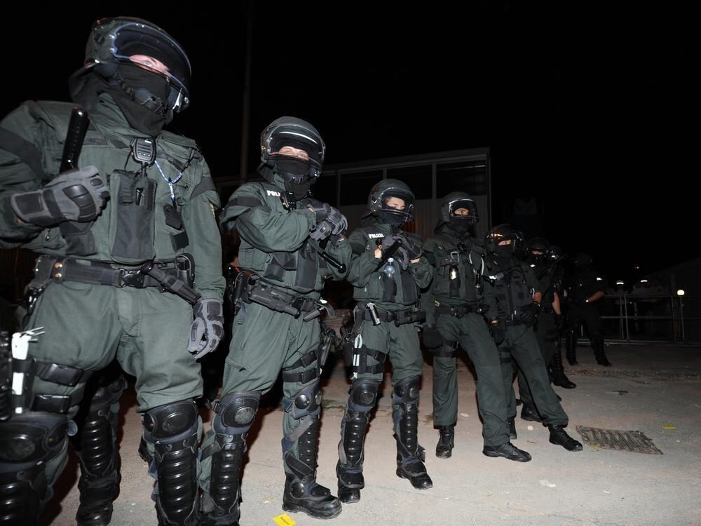 Polizisten sichern in Einsatzuniform die Baustelle von Stuttgart 21.
