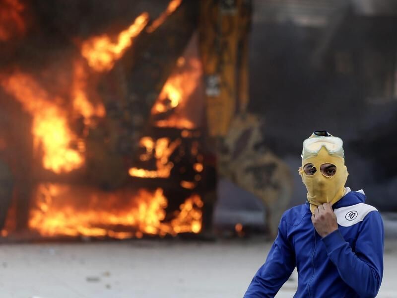 Ein vermummter Demonstrant vor einer brennenden Barrikade auf dem Istanbuler Taksim-Platz. Foto: Tolga Bozoglu