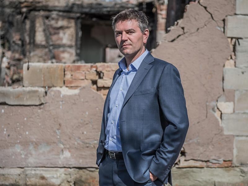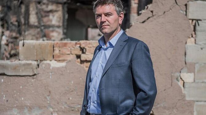 Bürgermeister Ian Schölzel steht vor der Ruine des geplanten Flüchtlingsheims. Foto: Wolfram Kastl