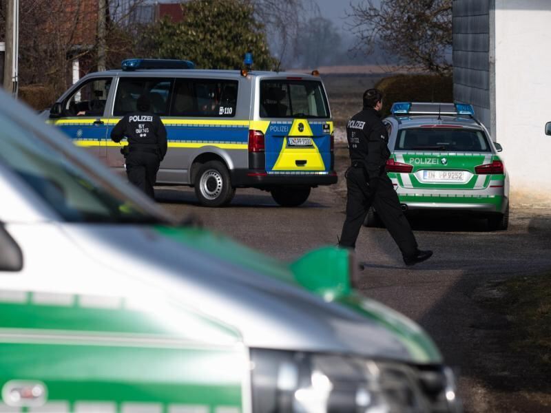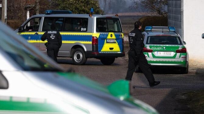 Polizisten vor einem Wohnhaus in Pliening in Bayern. Foto: Matthias Balk