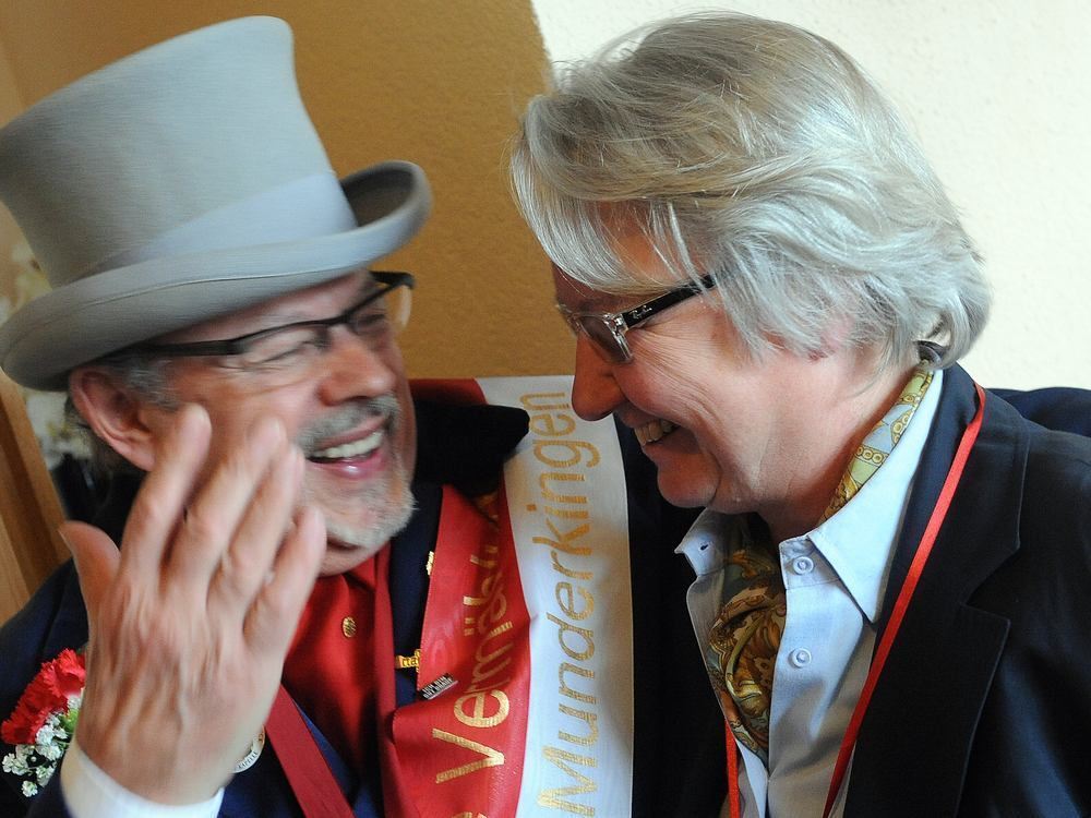 Auf Wahlkreistour: Annette Schavan steht in Ehingen neben dem Narrenzunftmeister Lothar Huber.