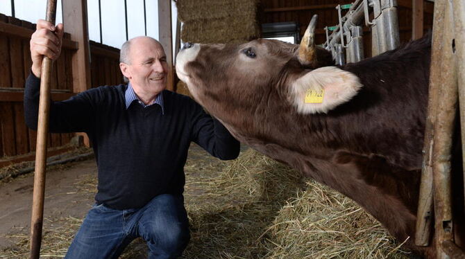Waldemar Westermayer, Vorsitzender des Leutkircher CDU-Stadtverbands und Vorsitzender des Bauernverbands Allgäu-Oberschwaben, posiert am in Leutkirch im Allgäu in seinem Kuhstall.