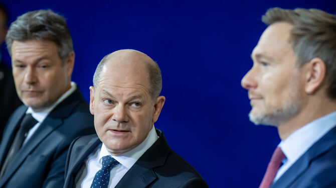 Kanzler Scholz ruft zum Wirtschaftsgipfel. Doch Wirtschaftsminister Robert Habeck (links) und Finanzminister Christian Lindner (rechts) sind nicht eingeladen.