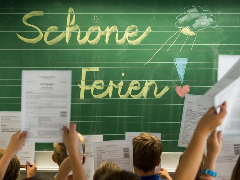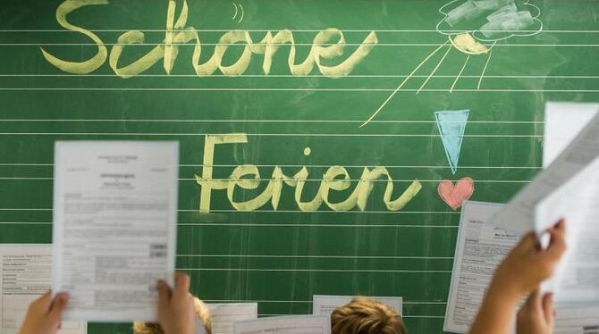 »Schöne Ferien!« Drittklässler mit ihren Jahreszeugnissen. Foto: Armin Weigel/Archiv