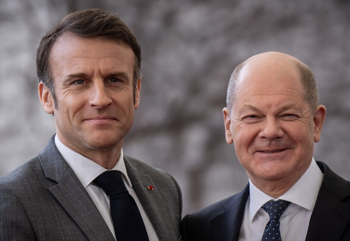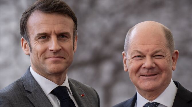 In Sachen Schutzzölle für chinesische E-Autos sind sich Frankreichs Präsident Emmanuel Macron und Bundeskanzler Olaf Scholz (rechts) nicht einig. FOTO: KAPPELER/DPA