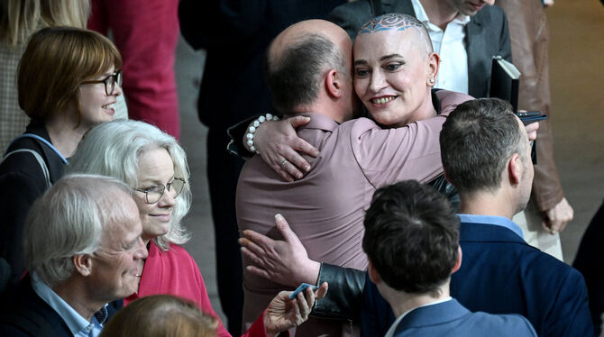 Tessa Ganserer (Bündnis 90/Die Grünen) und Sven Lehmann (Bündnis 90/Die Grünen), Parlamentarischer Staatssekretär für Familie, Senioren, Frauen und Jugend, umarmen sich am Rande der namentlichen Abstimmung zum Selbstbestimmungsgesetz während der 164. Sitzung des Bundestages.