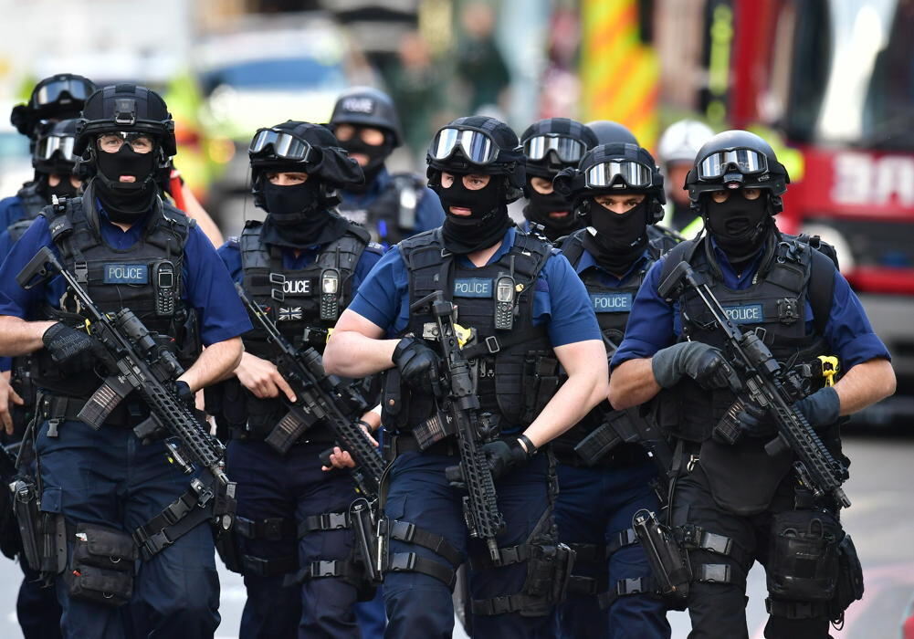Schwer bewaffnete Polizisten patrouillieren in London im Bereich um die London Bridge und den Borough Market.