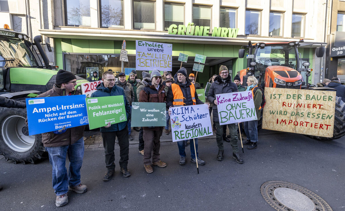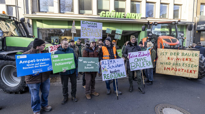 Landwirte demonstrieren vor der Parteizentrale der Grünen in Düsseldorf gegen die Sparpläne der Bundesregierung. FOTO: REICHWEIN/DPA