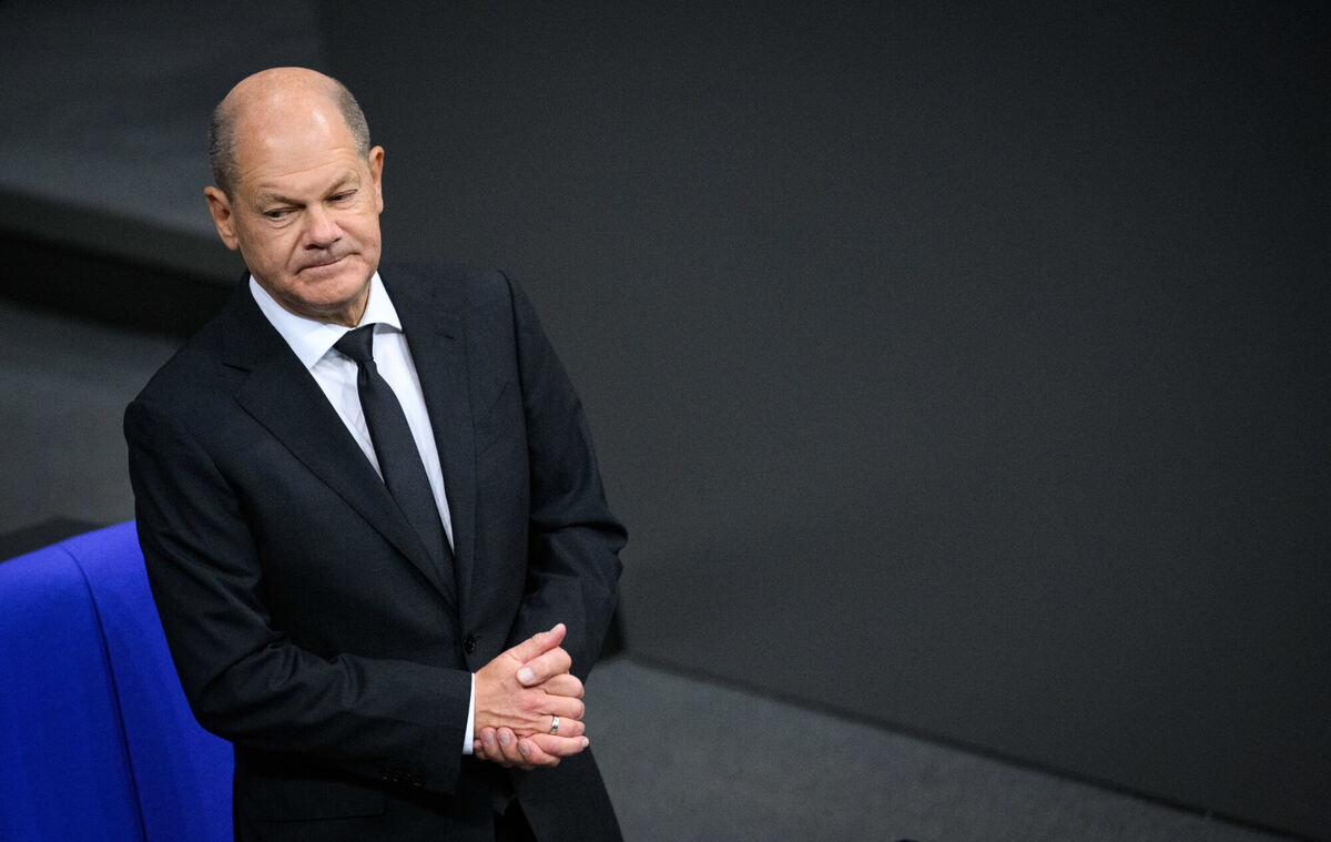 Bundeskanzler Olaf Scholz (SPD) mit schwarzer Krawatte als Zeichen der Trauer für die Hamas-Opfer. FOTO: VON JUTRCZENKA/DPA