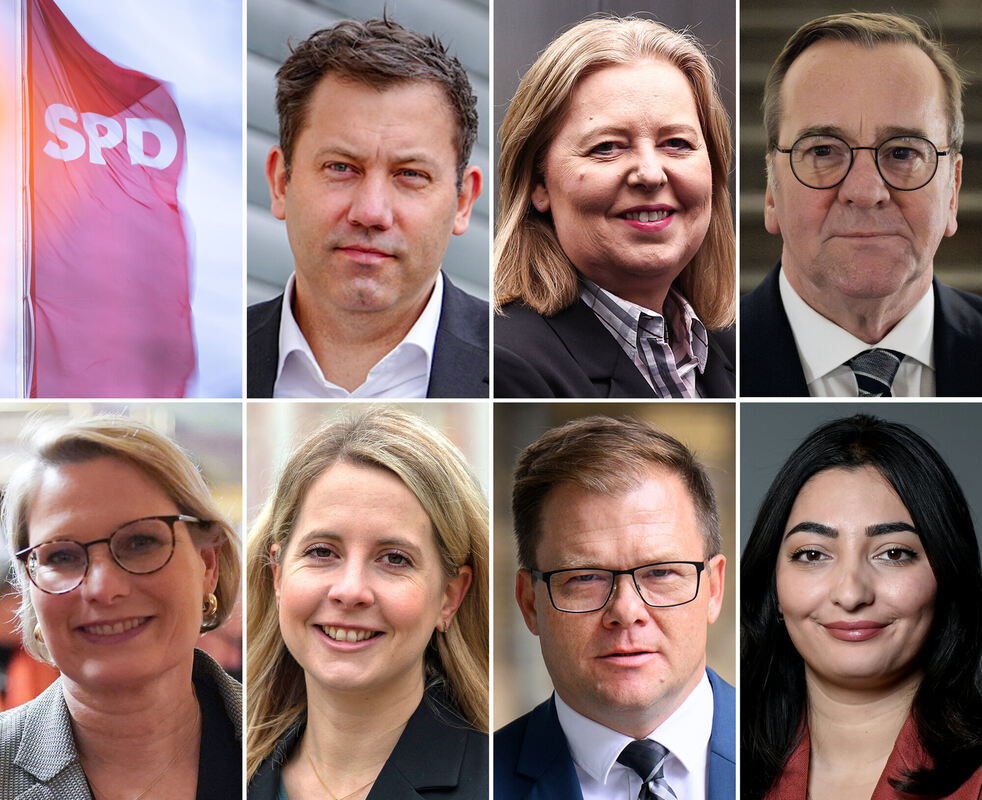Das geplante Minister-Tableau der SPD: Der designierte Vizekanzler und SPD-Parteichef Lars Klingbeil , Bärbel Bas , Boris Pistorius, Stefanie Hubig, Verena Hubertz , Carsten Schneider und Reem Alabali-Radovan.