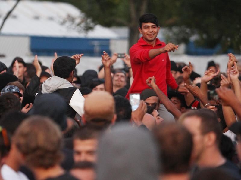 Flüchtlinge und ihre Unterstützer tanzen und feiern bei einer Kundgebung vor der Flüchtlingsunterkunft in Heidenau. Foto: Sebastian Willnow