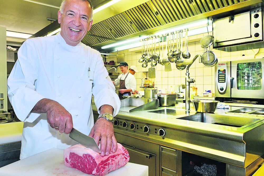 Kochen macht ganz offensichtlich froh: Gerd Windhösel am Rostbraten. Der Erpfinger Koch hat seit 24 Jahren einen Michelin-Stern und ist immer noch angespannt. FOTO: NIETHAMMER