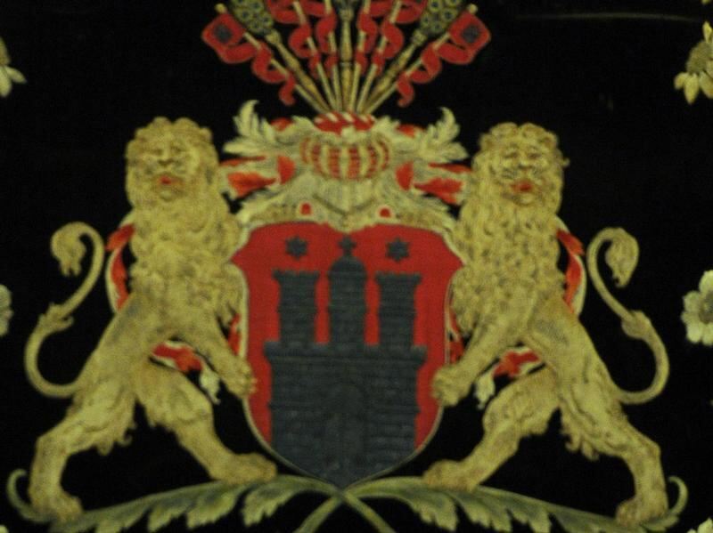 Das Wappen der Hansestadt hinter dem Platz des Bürgerschaftspräsidenten im Rathaus von Hamburg.