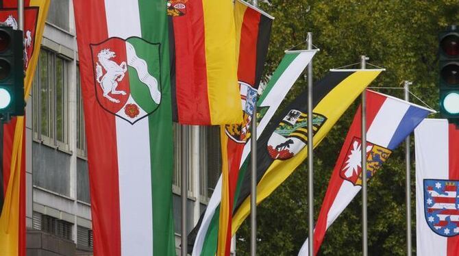 Fahnen verschiedener Bundesländer: Der Streit zwischen Gebern und Nehmern im Länderfinanzausgleich geht weiter. Foto: Frank Rumpenhorst