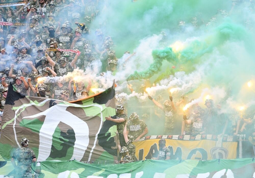 Dresdner Fans zünden im Karlsruher Wildparkstadion zu Spielbeginn bengalische Feuer.
