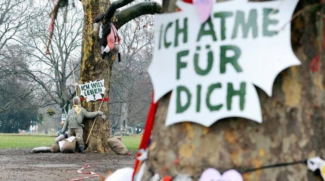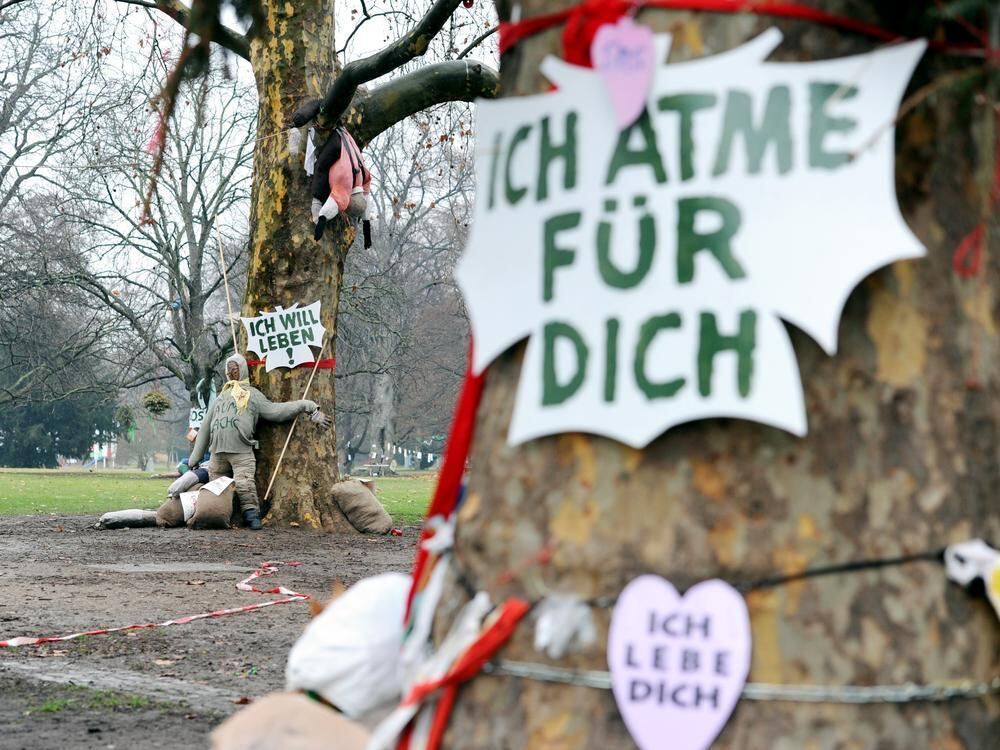 Protestschilder an den Bäumen des Stuttgarter Schlossgartens.
