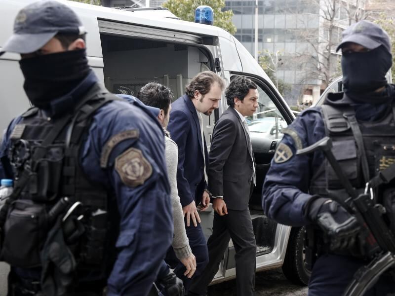 Zwei der insgesamt acht türkischen Soldaten werden in Athen von Polizisten in ein Verwaltungsgericht geführt. Foto: Yorgos Karahalis
