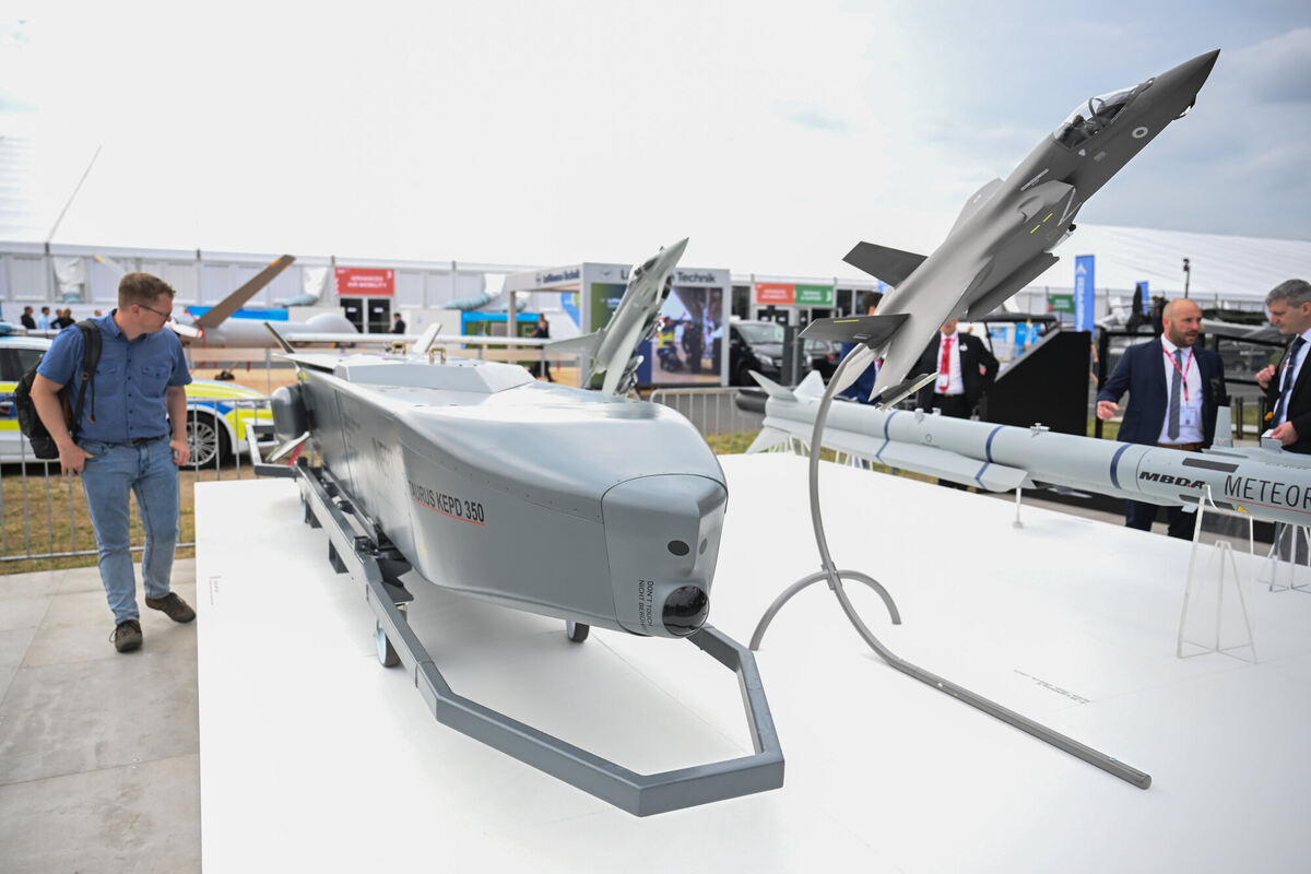Ein Mann schaut sich während der Internationalen Luft- und Raumfahrtausstellung (ILA) auf dem Gelände vom Flughafen Berlin Brandenburg (BER) eine Taurus Marschflugkörper am Stand von MBDA Deutschland an.