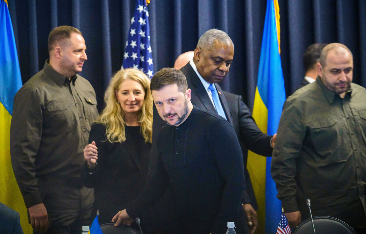 Wolodymyr Selenskyj (Mitte), Präsident der Ukraine, Lloyd Austin (Mitte rechts), Verteidigungsminister der USA, und Rustem Umjerow (rechts), Verteidigungsminister der Ukraine, nehmen am Treffen der Ukraine-Kontaktgruppe auf der US Air Base Ramstein teil. Verteidigungsminister und ranghohe Militärs beraten über die weitere Unterstützung der Führung in Kiew im Krieg gegen Russland.