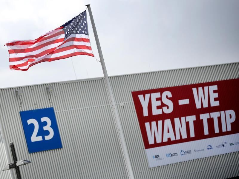 Eine amerikanische Flagge weht auf dem Gelände der Hannover Messe vor einem Plakat mit der Aufschrift »Yes - We want TTIP«. Foto: Christian Charisius