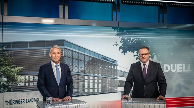 Björn Höcke (AfD, l) und Mario Voigt (CDU), Spitzenkandidaten für die Landtagswahl in Thüringen, stehen beim TV-Duell bei Welt TV.