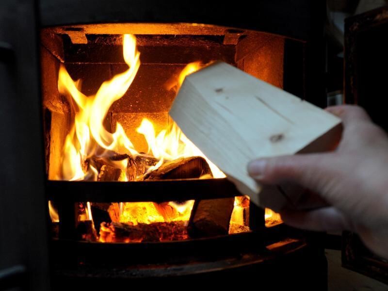 Ein Mann steckt Holz in einen Ofen. Foto: dpa