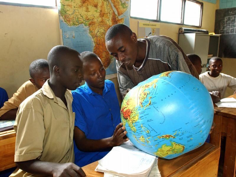 Ein Lehrer in einer Schule im Westen Ruandas Schülern auf einem aufblasbaren Globus Ländergrenzen. (Archivbild)