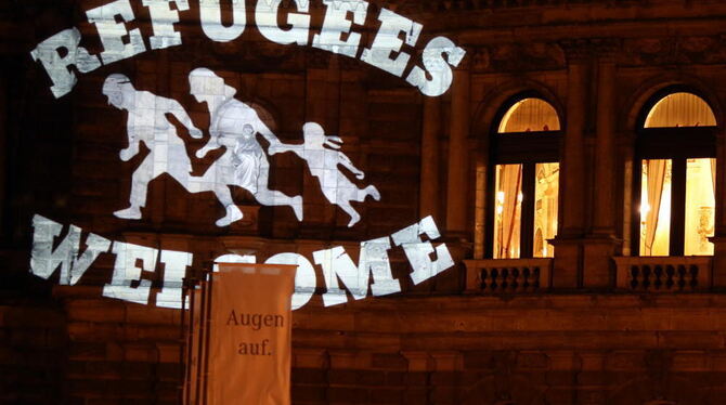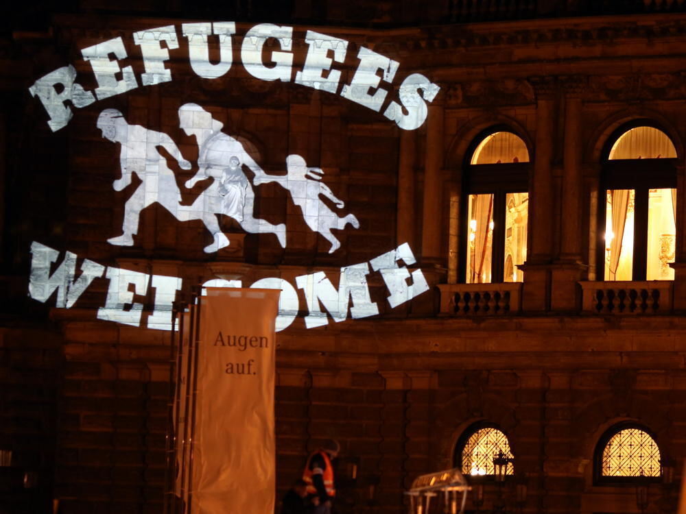 Der Schriftzug »Refugees welcome« wird in Dresden von Aktivisten des »Bündnisses Dresden Nazifrei« an die Fassade der Semperoper projeziert während hier Anhänger des »Pegida«-Bündnisses (Patriotische Europäer gegen die Islamisierung des Abendlandes) gegen die angebliche Überfremdung durch Flüchtlinge demonstrieren. (Archivbild)