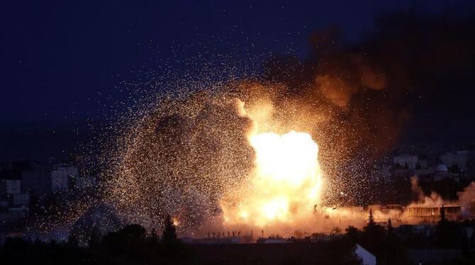 Explosion während eines Luftangriffs der internationalen Anti-IS-Allianz auf Kobane. Im Kampf um die nordsyrische Stadt Kobane hoffen die Kurden auf eine Wende. Foto: Sedat Suna