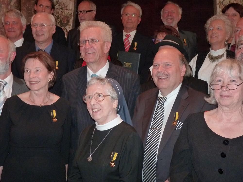 Die Geehrten mit Ministerpräsident Winfried Kretschmann.Ganz links: Eva Köhler, die Frau des früheren Bundespräsidenten. Auch GEA-Verleger Valdo Lehari jr. (rechts) wurde mit dem Landesverdienstorden ausgezeichnet.