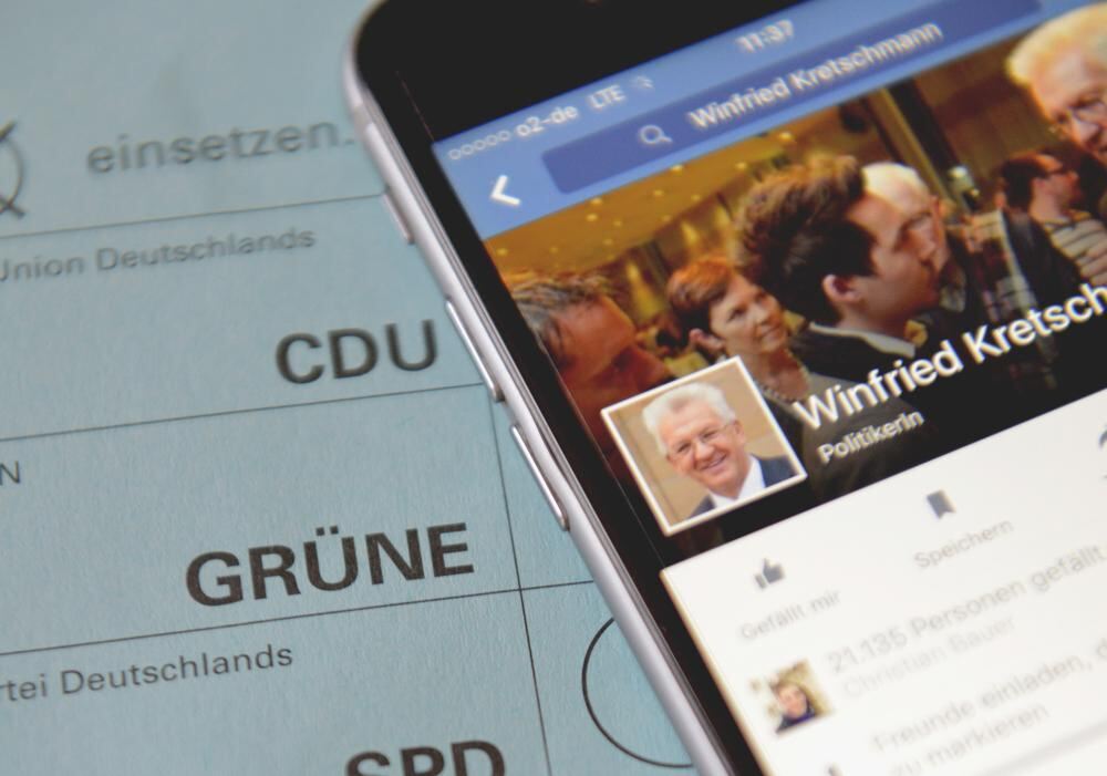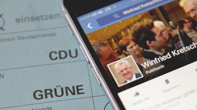 Unter einem Smartphone mit einem Facebook Post vom baden-württembergischen Ministerpräsidenten Winfried Kretschmann (Bündnis 90 / Die Grünen) liegt ein Wahlschein für die Landtagswahl in Baden-Württemberg.