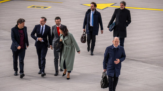 Olaf Scholz und seine Minister von Grünen und FDP haben sich vertagt und laufen zum Flugzeug nach Holland. FOTO: KAPPELER/DPA